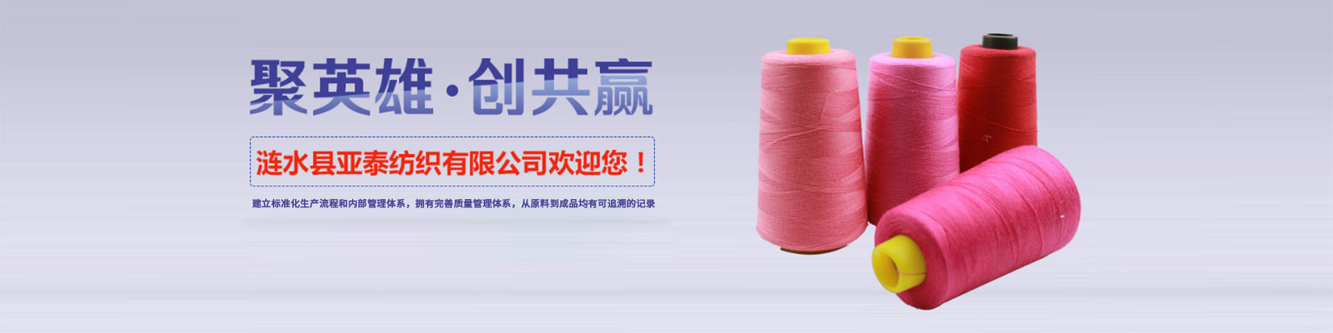 漣水縣亞泰紡織有限公司位于江蘇漣水縣,公司專業生產各種縫制線、織帶織布線、漁網線、輪胎線、風箏線等產品,廣泛應用于服裝、鞋帽、皮革、箱包、家紡、帳篷、漁業、勞保用品、運動用品、特種行業,材質有滌綸、錦綸、氨綸等,滿足各行各業對線的需求。公司始創于1998年,擁有整套先進的染色制線設備,專業的技術管理人員,先進的生產工藝。歡迎您光臨指導、洽談合作!